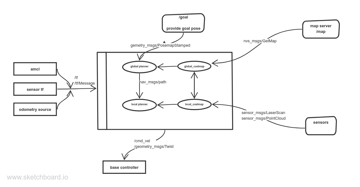 The graph shows how the move_base node interacts with other system components. The node implements SimpleActionServer from actionlib package, The Action server provides /goal topic that will provide the move_base node with goal positions.